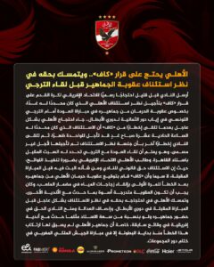 أصدر النادي الأهلي المصري بلاغا منذ قليل عبّر فيه عن احتجاجه عن احتجاجه عن تأجيل "الكاف" للنظر في استئنافه بخصوص عقوبة المنع من دخول الجماهير في دوري أبطال أوروبا مطالبا بالنظر في الملف قبل لقاء الترجي.