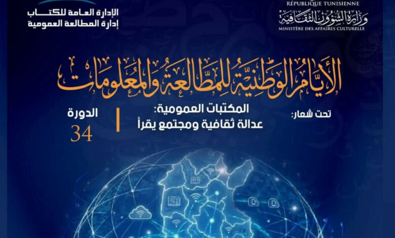 تحت إشراف وزارة الشؤون الثقافية تنظم إدارة المطالعة العمومية بالإدارة العامة للكتاب في إطار البرنامج السّنوي للترغيب في المطالعة الدورة 34 من الأيام الوطنيّة للمطالعة والمعلومات من 15 أفريل إلى 15 ماي 2026 تحت شعار “المكتبات العمومية: عدالة ثقافية ومجتمع يقرأ”، وهو شعار يترجم التوجهات الاستراتيجية لوزارة الشؤون الثقافية نحو تكريس الحقوق الثقافية لكل المواطنين وضمان الوصول العادل للمعرفة لكافة الفئات وتكريس دور المكتبة العمومية كفضاء للإدماج الاجتماعي ومركز حيوي للتبادل الفكري من أجل تحقيق مبدأ تكافؤ الفرص بين جميع فئات المجتمع، بغض النظر عن مستواهم الاقتصادي أو الاجتماعي، فالمكتبة العمومية فضاء ثالث شامل للإدماج والتمكين من خلال توفير المعلومة المجانية والخدمات الرقمية للجميع.